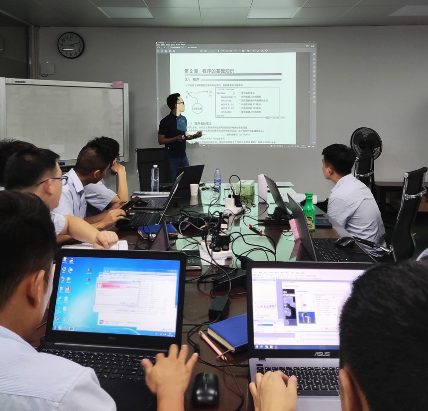 This manipulator training lasts for 2 days. The training content mainly includes the basic operation of the multi-function teach pendant, the basic knowledge of the program & the start of WINCAP3, the 3D view of the arm, the tool definition of the 4&6 axis robot, the process control command, and the utilization of built-in objects.